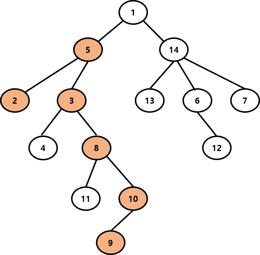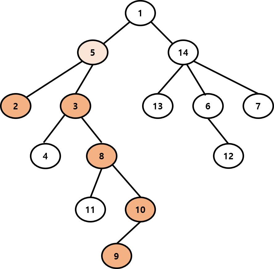 두 노드가 같아졌으므로 최소 공통 조상은 5번 노드이고, 5번 노드부터 부모 노드를 쭉 탐색해나간다면 조상 노드를 모두 찾을 수 있습니다.