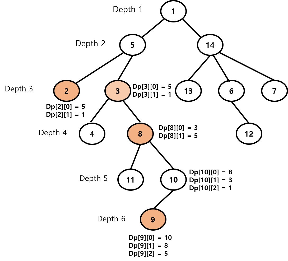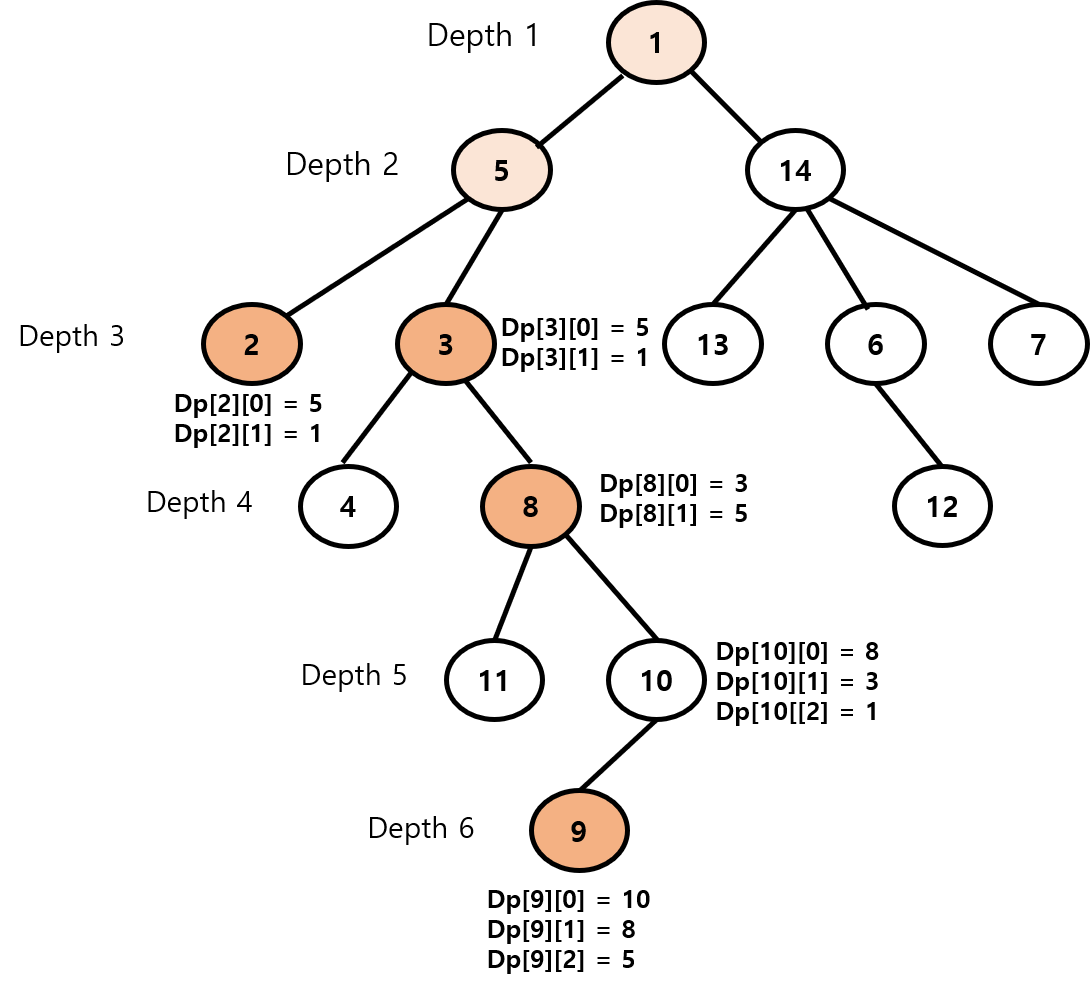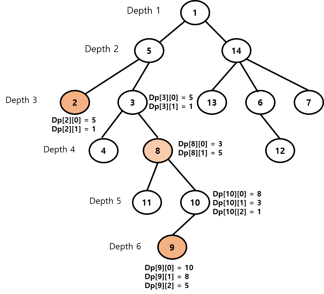 9번 노드가 깊이가 더 깊고, DP[9] [2] = 5번 노드는 2번 노드랑 깊이 얕으므로 넘어가고, DP[9] [1] = 8번 노드는 2번 노드보다 깊이가 깊으므로 9번 노드를 한 번에 8번 노드로 올려줍니다.