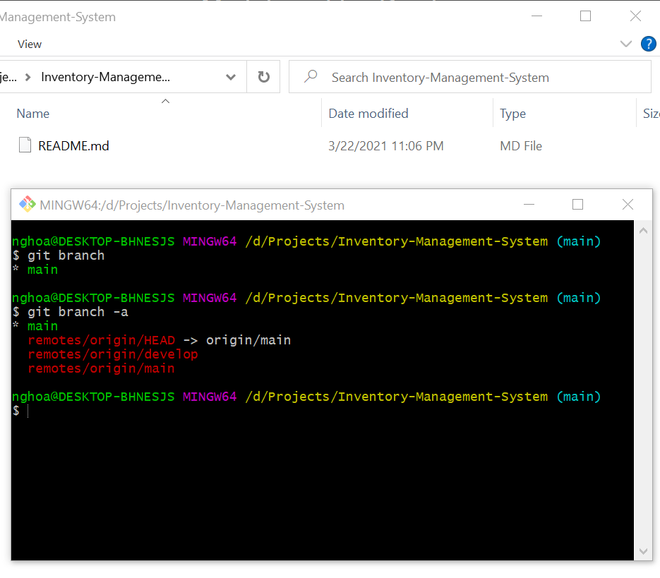 Bước 2: Gõ lệnh sau để kiểm tra tất cả các branch hiện có trên máy và trên GitHub(remote)