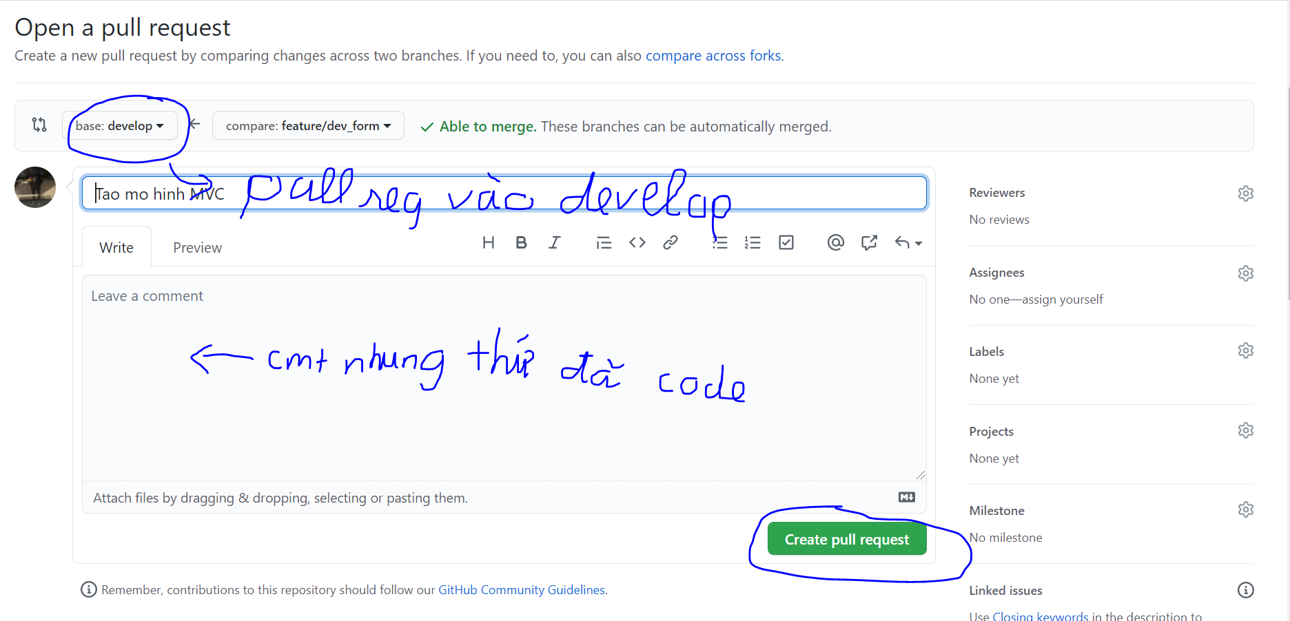 Không được nhấn merge pull request, phần quyết định merge code hay ko là do nhóm trưởng thực hiện vào sau khoảng 10h tối