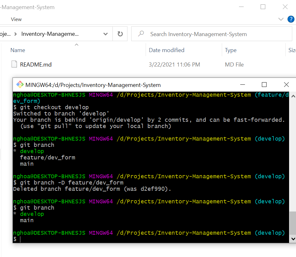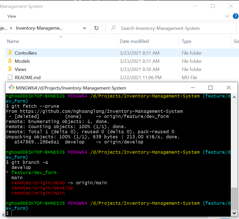 Sau khi thấy branch feature/dev_form trên remote đã bị xóa, tức là code đã được accept và merge vào branch develop -> tiến hành xóa branch feature/dev_form dưới máy