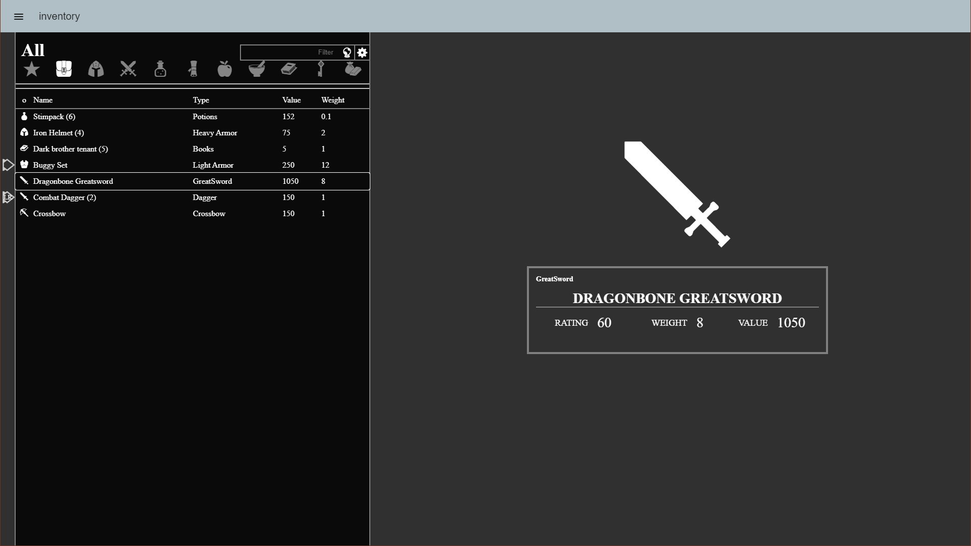 valorad/inventory:latestRedux和GraphQL是针对大型复杂项目的,而自己能想到的大型一点的,但是又不是复杂到我无法完成的项目中,物品栏可能是比较合适的。业务逻辑比较清晰,比较灵活,比较常见。