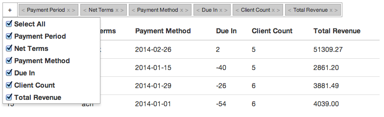 defaultColumns : an array of the column titles you want shown upon load.